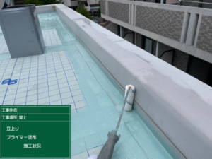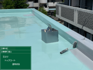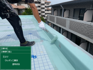 その後、立ち上がりから順にウレタン防水材を丁寧に塗布し、均一で強固な防水層を形成していきました。