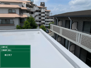 施工後は屋上全体にしっかりとした防水層が形成され、雨水の浸入を防げる状態になりました。