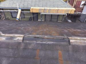 実際に屋根へ上がって確認すると、屋根材は経年劣化によって全体的に黒ずみやカビが進み、防水性能の低下が見られる状態でした。