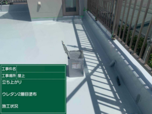防水層については、ウレタン防水材を2層に分けて丁寧に施工し、十分な厚みと強度を確保しました。