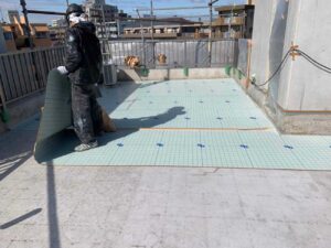 プライマーを塗布し、上から緩衝シートを敷設、これにより下地からの影響を抑える通気層を確保させます。