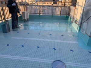 その後、ひび割れ補修や下地調整を丁寧に行い、防水施工に適した状態に整えます。