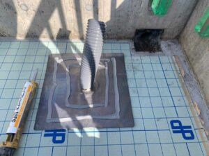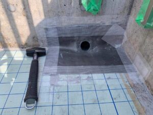 改修ドレンの取り付けと下地の湿気を逃がすための脱気筒を取り付けます。