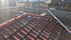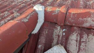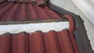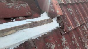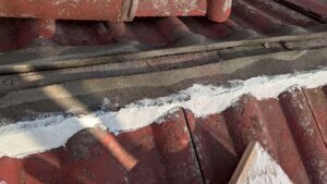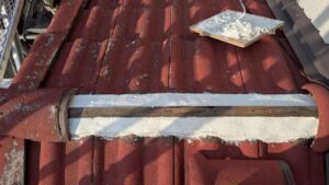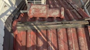 現地で調べると、屋根の一番高い部分に設置されている棟瓦の漆喰が痩せてきており、隙間が生まれていました。
